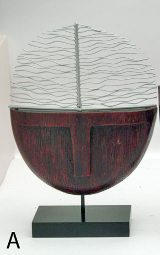 Timber and metal, hand-painted, red/brown/maroon/silver