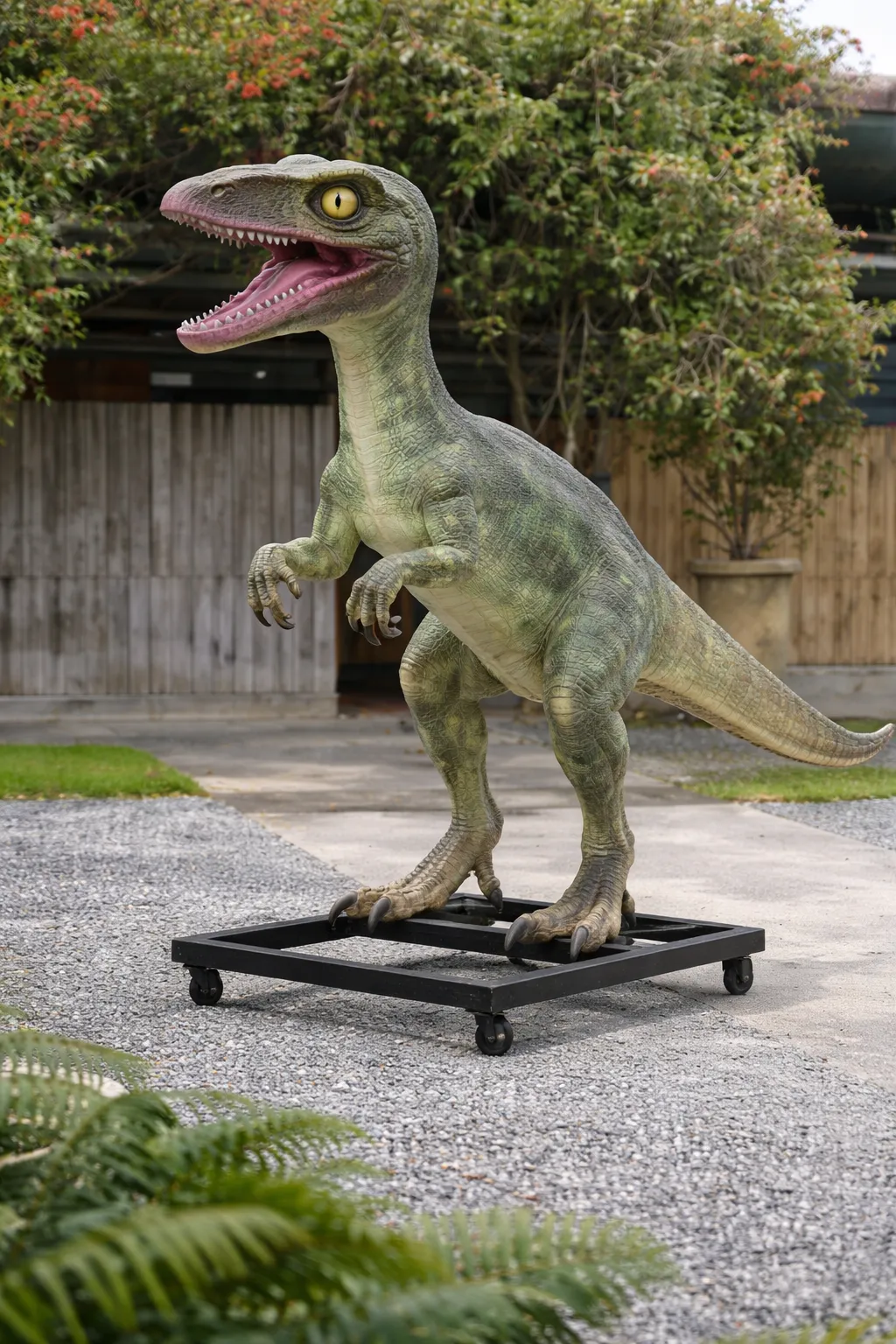 Make a massive prehistoric statement with this T-Rex (Tyrannosaurus) fiberglass statue. Designed with impressive scale and detail, this large dinosaur creates a powerful visual impact in any setting. Mounted on wheels for easy positioning, it is both striking and practical.